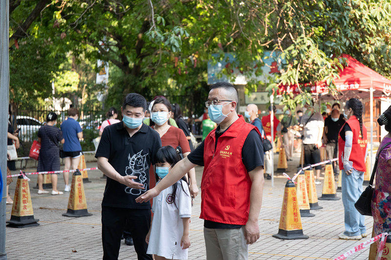 一个个“红马甲”穿梭在人群中,忙碌地指挥着队伍、测体温、查验健康码、帮助录入信息… …酷暑难耐,工作繁琐,可是没有一个人停下来,没有一个人发牢骚。