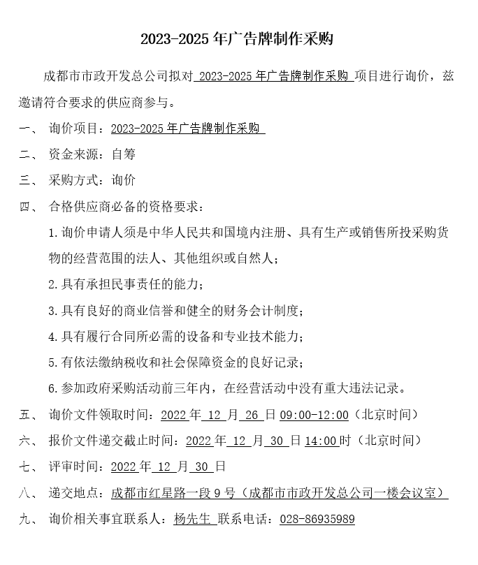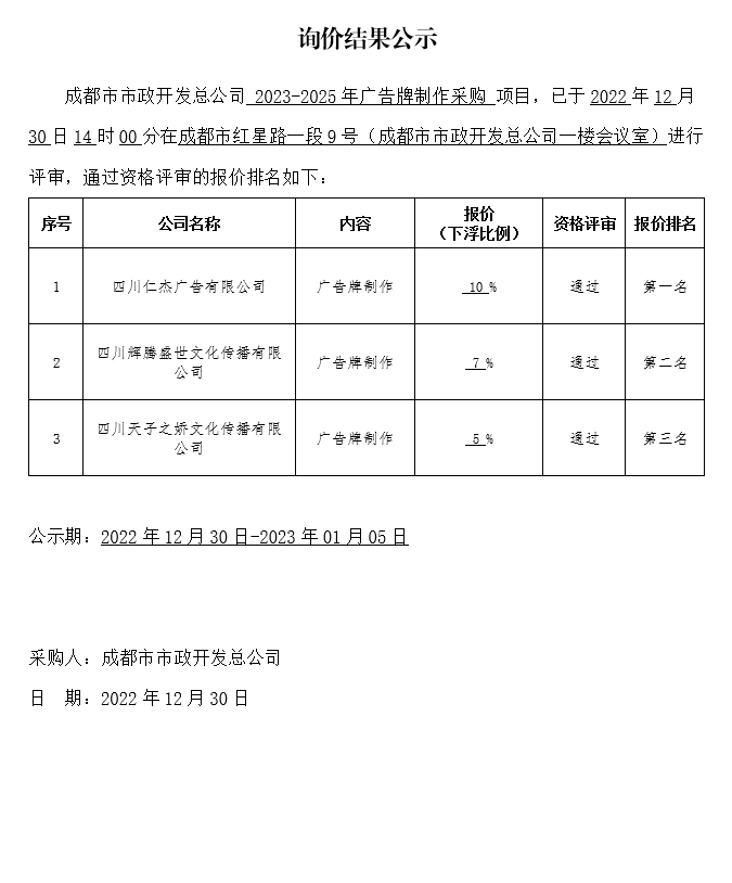 2023-2025年广告牌制作采购询价结果公示