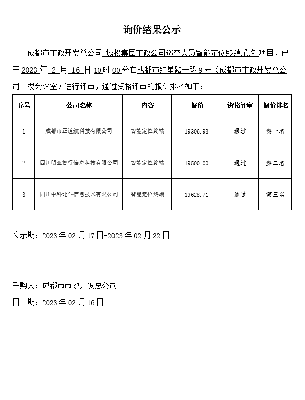 成都市市政道桥机械设备租赁有限公司干杂调料采购询价结果公示