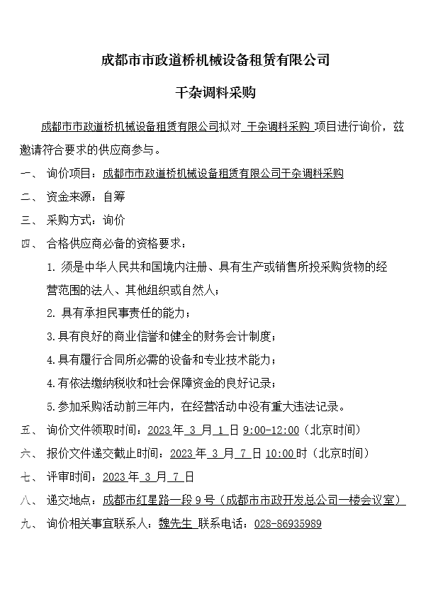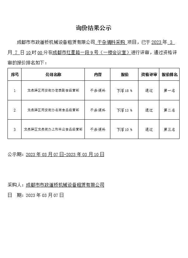 成都市市政道桥机械设备租赁有限公司干杂调料采购询价结果公示