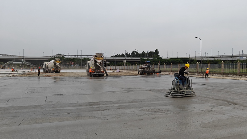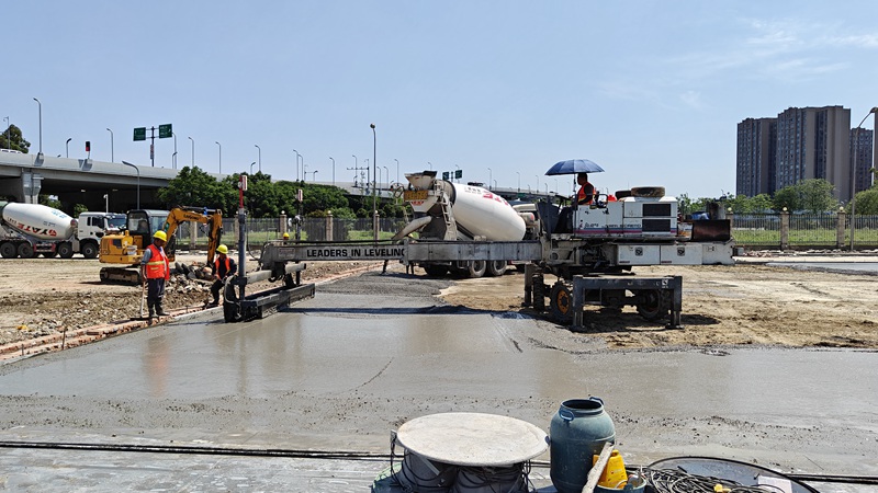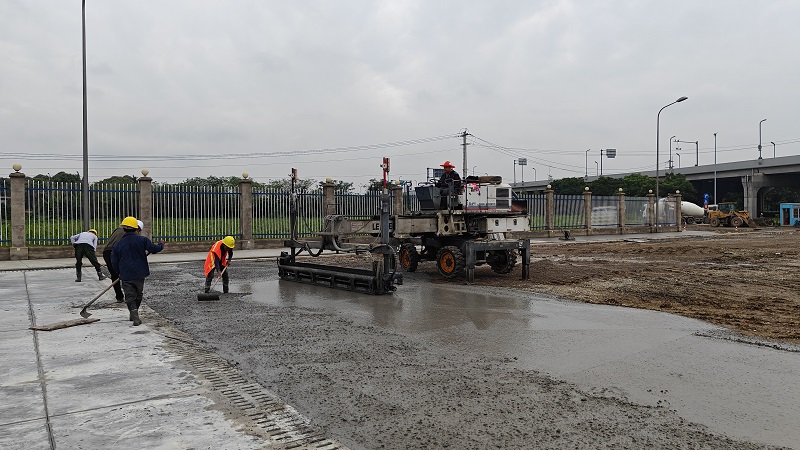 该工程混凝土浇筑体量大,工期紧张,现场混凝土浇筑使用混凝土激光整平机配合人工施工,提高了施工效率,确保了施工质量。施工过程中,公司科学安排施工顺序,精心组织材料、机械、劳务等资源配置,克服了高温天气施工、雨季施工、臭氧污染管控等不利因素对现场施工的影响,经过连续18天的紧张施工,于5月23日完成全部施工任务。