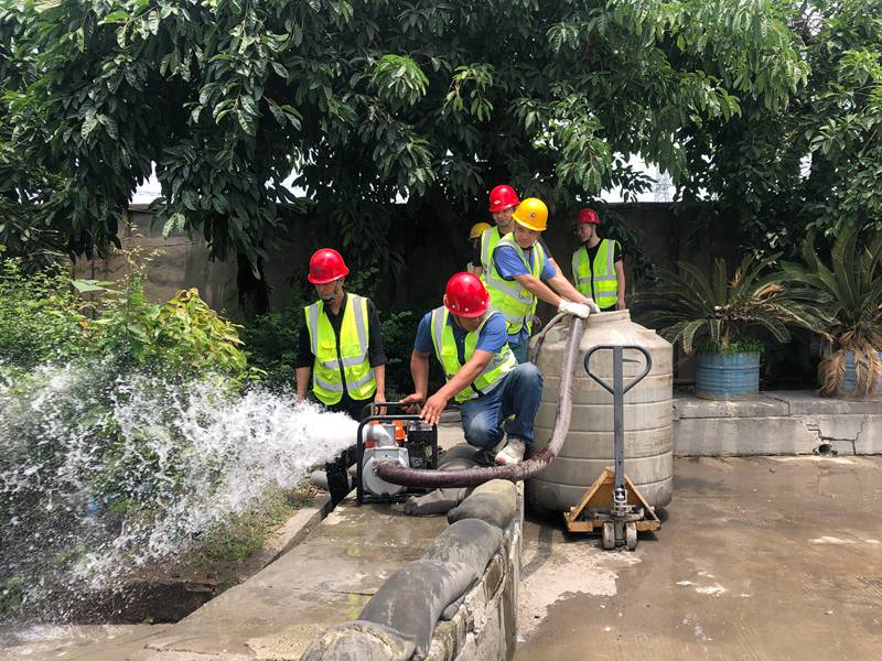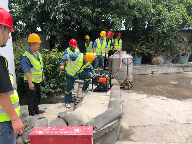 紧接着进行了防汛演练。因强降雨造成配电房水势猛涨,值班人员发现险情后迅速上报险情,防汛指挥部根据水位深度,立即启动“三级响应”流程。抢险人员按照规定流程分工明确、配合默契,迅速安装防汛器械和布设防汛沙袋,仅用30分钟完成积水抽排,快速解除险情,挽救了公司财产。
