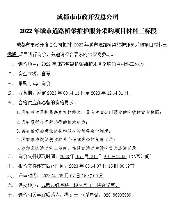 jS333金沙线路2022年市管中环路、成洛大道、神仙树高架群日常维护服务采购项目材料采购询价结果公示