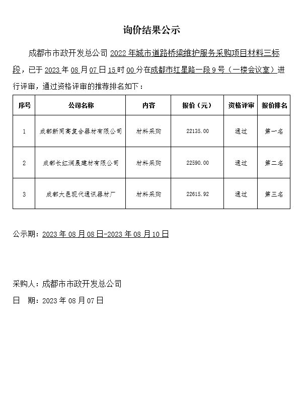 jS333金沙线路2022年城市道路桥梁维护服务采购项目材料三标段询价结果公示