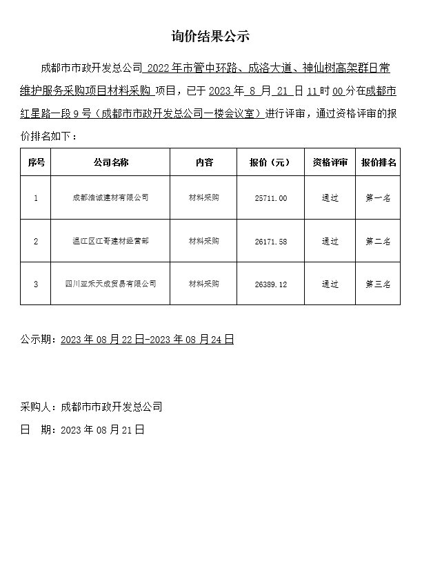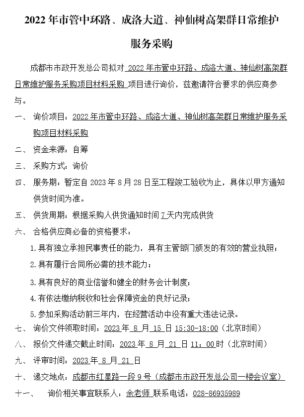 jS333金沙线路2022年市管中环路、成洛大道、神仙树高架群日常维护服务采购项目材料采购询价结果公示