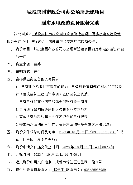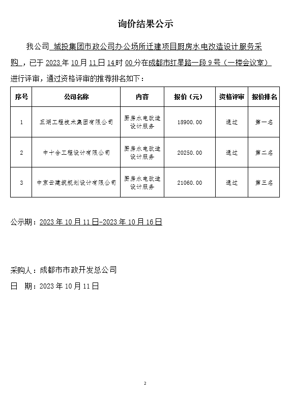城投集团jS333金沙线路办公场所迁建项目厨房水电改造设计服务采购询价结果公示