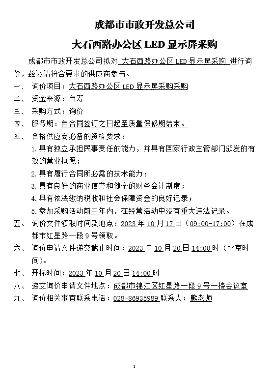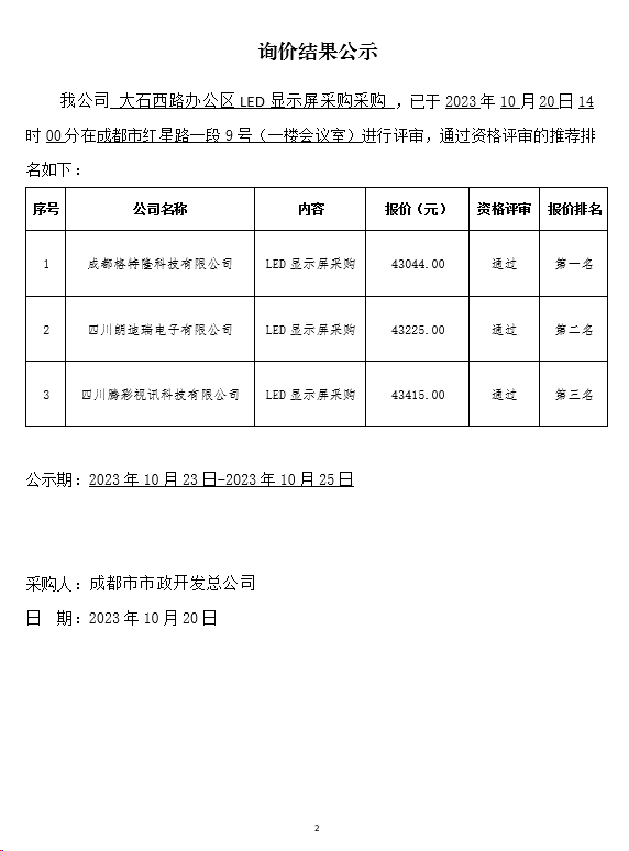 jS333金沙线路大石西路办公区LED显示屏采购询价结果公示