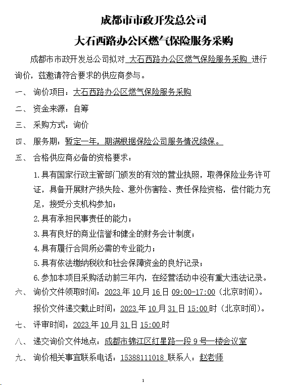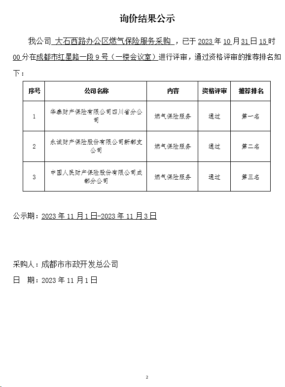jS333金沙线路大石西路办公区燃气保险服务采购询价结果公示