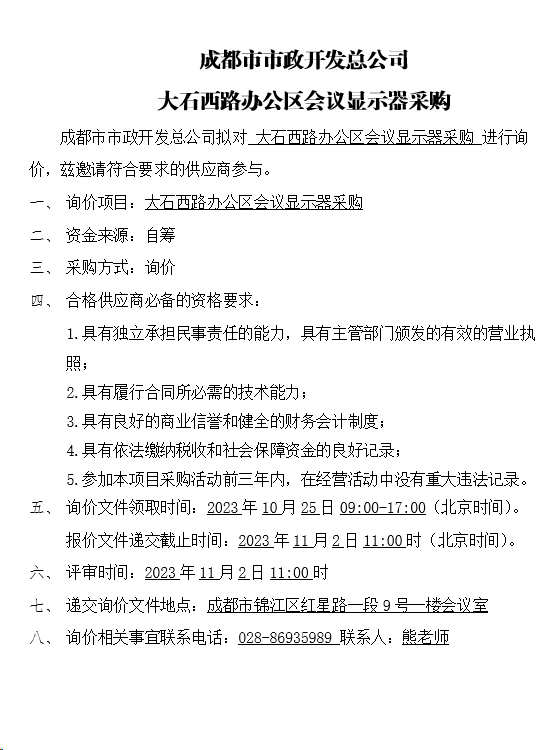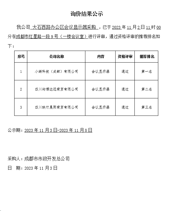 jS333金沙线路大石西路办公区会议显示器采购结果公示