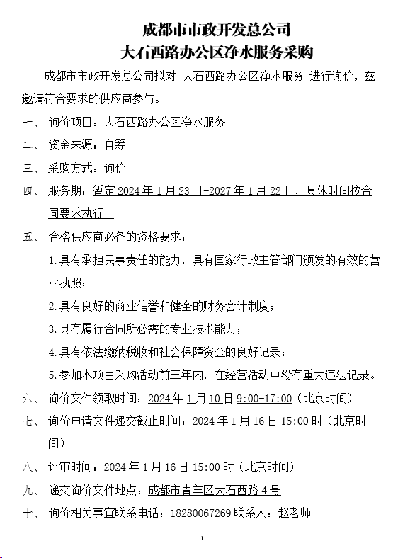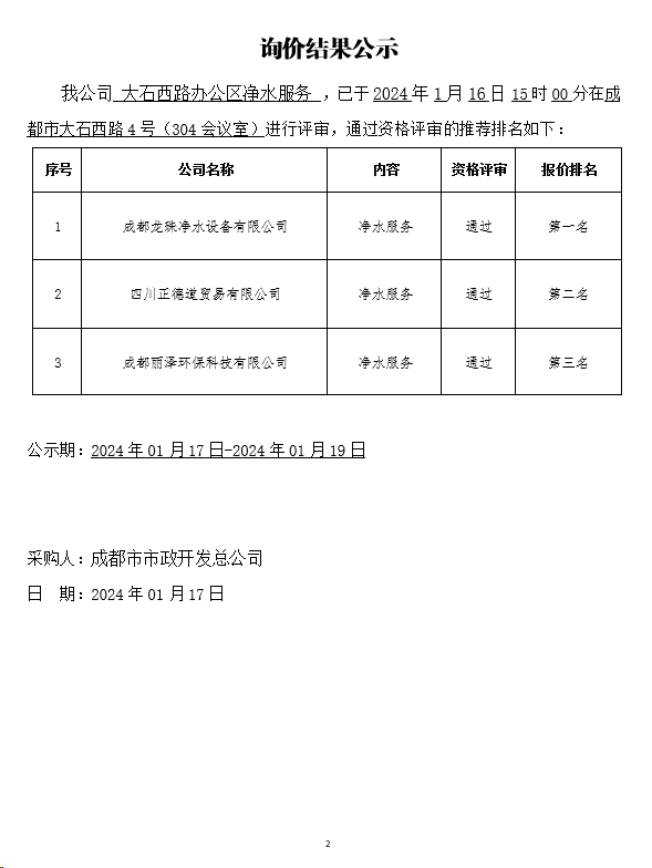 jS333金沙线路大石西路办公区净水服务采购询价结果公示