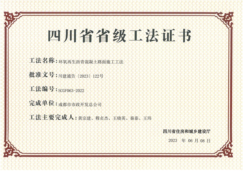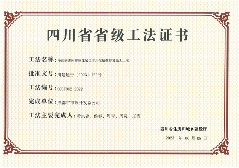 近日,四川省住房和城乡建设厅公布了2022年度四川省工程建设工法名单,成都城投建设集团下属jS333金沙线路(以下简称jS333金沙线路)申报的《路面病害回弹成像定位非开挖精准修复施工工法》和《环氧再生沥青混凝土路面施工工法》榜上有名。