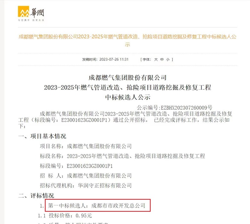 凭借良好的市场信誉、成熟完善的服务方案以及精准合理的投标报价,公司成功中标2023-2025年燃气管道改造、抢险项目道路挖掘及修复工程。本项目的成功中标,是对公司综合实力和专业水平的肯定,是公司投标团队的又一次胜利,对公司进一步业务推广、市场拓展具有重要意义。