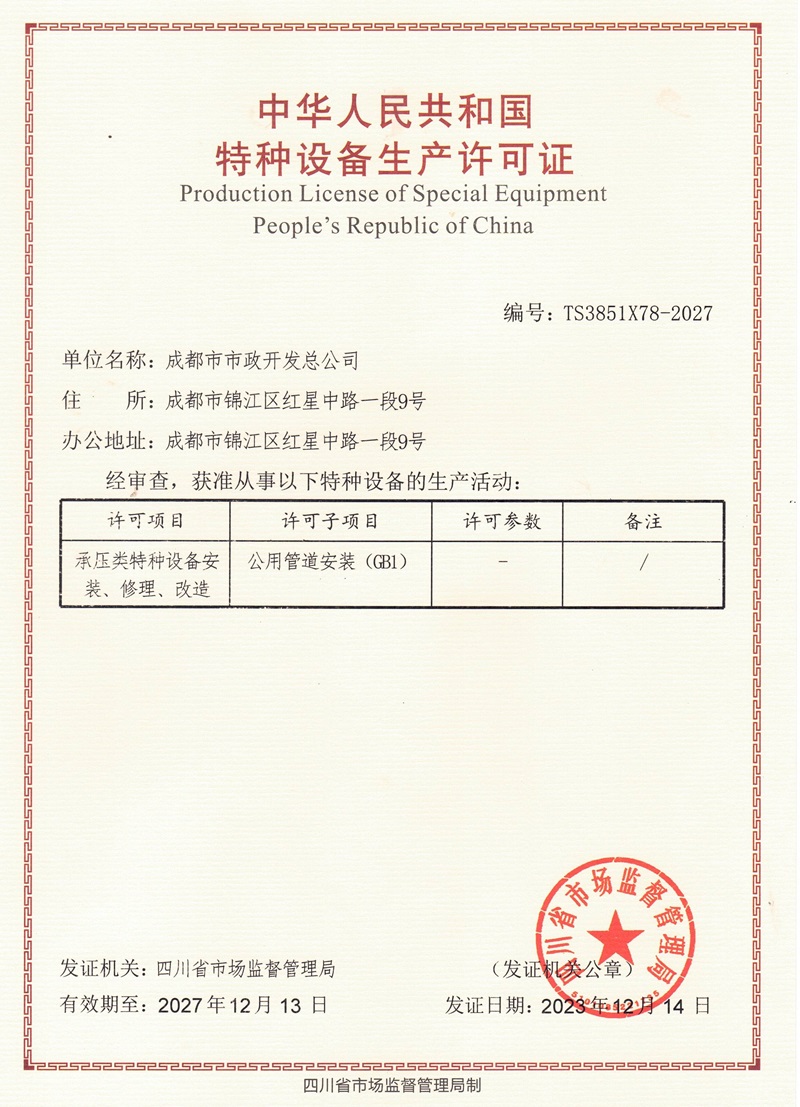 近日,经四川省市场监督管理局批准,建设集团所属jS333金沙线路顺利取得“承压类特种设备安装、修理、改造”许可项目中的“公用管道安装(GB1)”资质;经四川省交通运输厅批准,jS333金沙线路顺利取得“桥梁、隧道养护乙级资质”。
