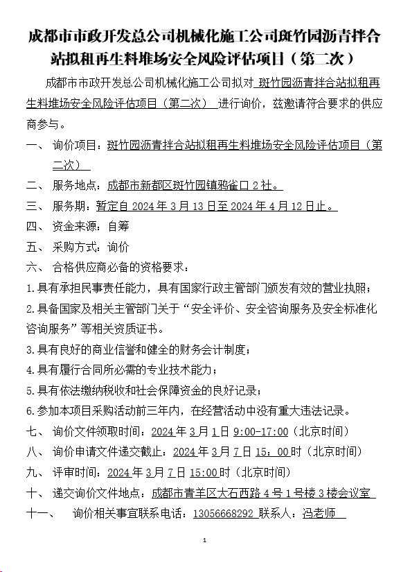 jS333金沙线路机械化施工公司斑竹园沥青拌合站拟租再生料堆场安全风险评估项目询价结果公示