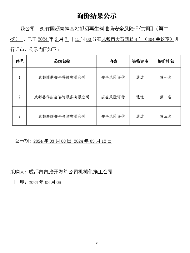 jS333金沙线路机械化施工公司斑竹园沥青拌合站拟租再生料堆场安全风险评估项目(第二次)询价结果公示