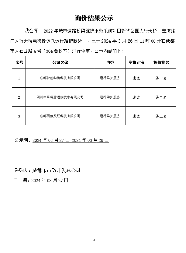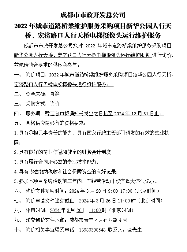 2022年城市道路桥梁维护服务采购项目新华公园人行天桥、宏济路口人行天桥电梯摄像头运行维护服务询价结果公示