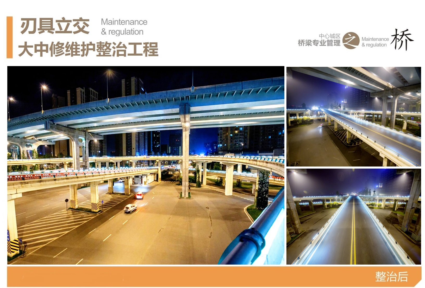 刃具立交位于成都市二环路北四段与东一段相交处,桥梁全长3225m,宽7.5~16m,为三层互通式桃型立交。该桥于1992年6月建成通车,我单位于2015年对该桥进行桥梁加固大中修维护,完成桥面铺装12000余平米,更换支座640余块,铰缝填充及浇筑2368余米,桥面涂装16500余平米。维护后的刃具立交焕然一新,更是为市民的出行提供了安全保障。