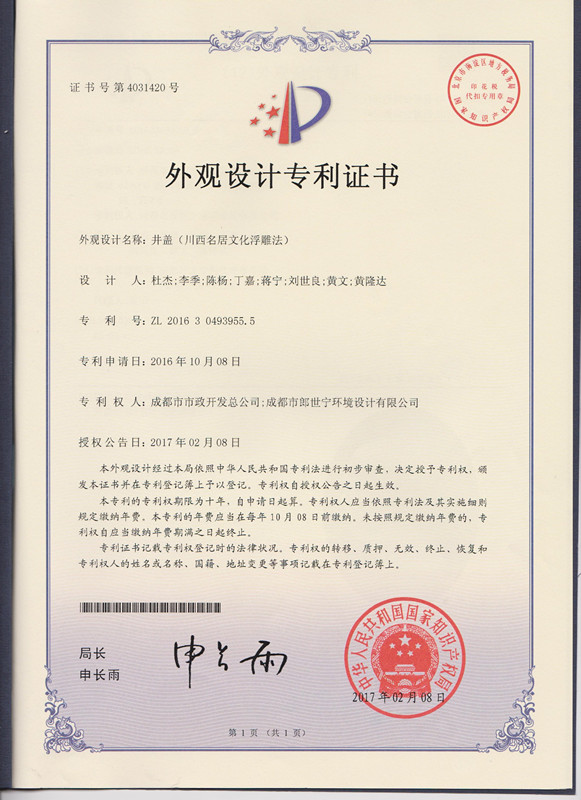 公司井盖研发工作再获佳绩,由公司联合成都市郎世宁环境设计有限公司共同设计研发的川西名居文化浮雕井盖获得了由中华人民共和国国家知识产权局颁发的名为“井盖(川西名居文化浮雕法)”的《外观设计专利证书》(证书号4031420),专利号为【ZL 2016 3 0493955.5】。
