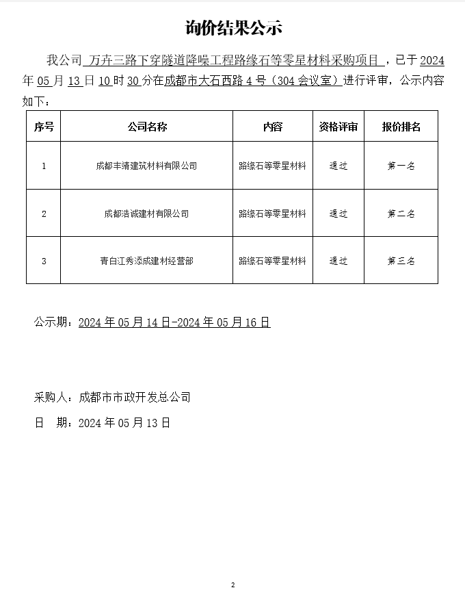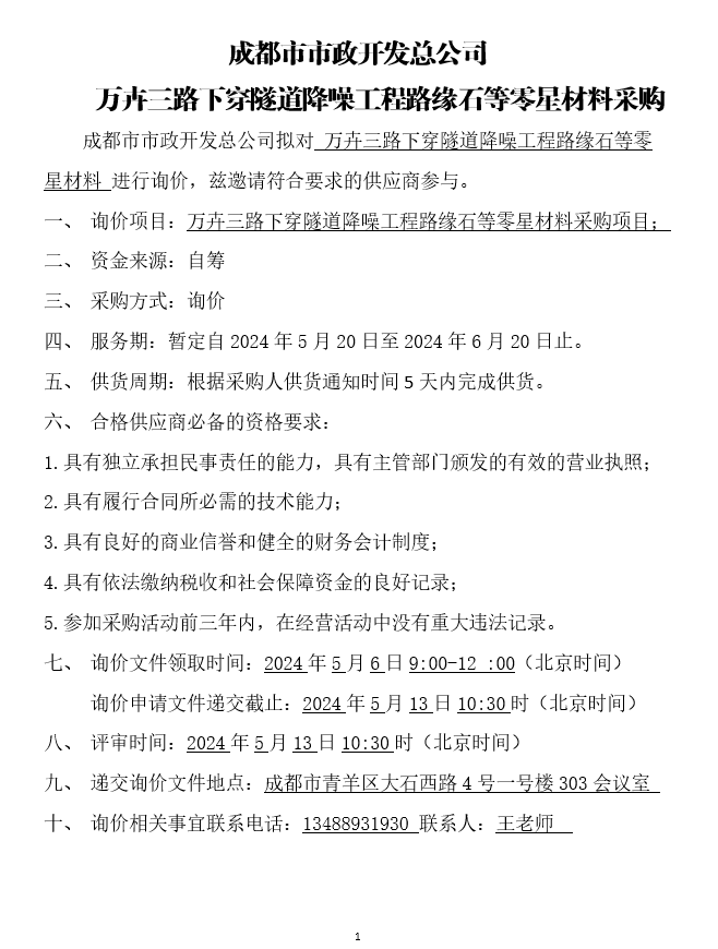 万卉三路下穿隧道降噪工程路缘石等零星材料采购项目询价结果公示