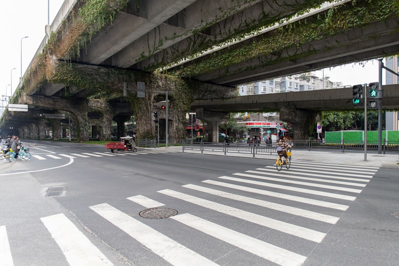 火车南站高架桥底层长寿路口也曾饱受交通瓶颈的困扰,因其下层道路汇入主道入口数量的不足,直接导致长寿路十字路口形成严重的交通拥堵节点。该点位拆除了人民南路四段(长寿路口)东侧辅路旁高架桥桥墩间的20米侧分带,增设辅路汇入桥下主道入口车道,有效提升了路口转换能力。