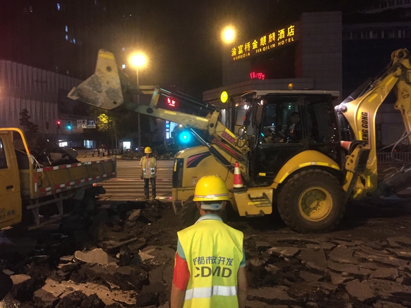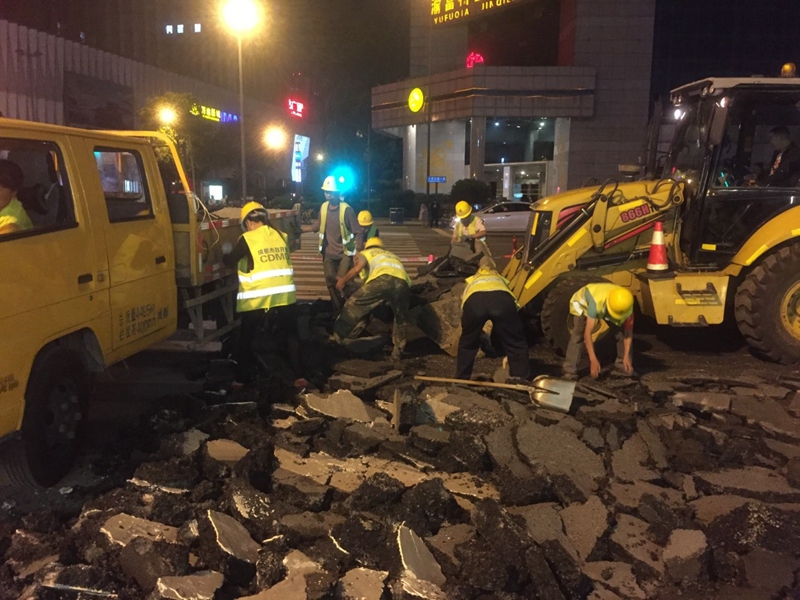 本次维护整治的道路病害位于成都市中轴线的人民北路(地铁站B口附近)非机动车道上,由于地基沉降,车行道明显凹陷,路面破损严重,影响了车辆行驶安全与城市美观。在公司现场管理人员的统筹协调下,施工人员紧锣密鼓、技艺娴熟,机械设备作业进场有序、操作规范。施工工作一直持续到凌晨5:00,当平整美观的路面出现在人们面前时,天已经蒙蒙亮了。