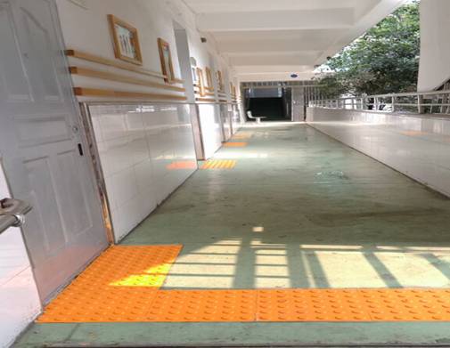 本次改造修复、增设了教学楼、宿舍及操场的橡胶盲道约75㎡,室外混凝土盲道47㎡,移交学校备用混凝土盲道250匹,橡胶盲道500匹。