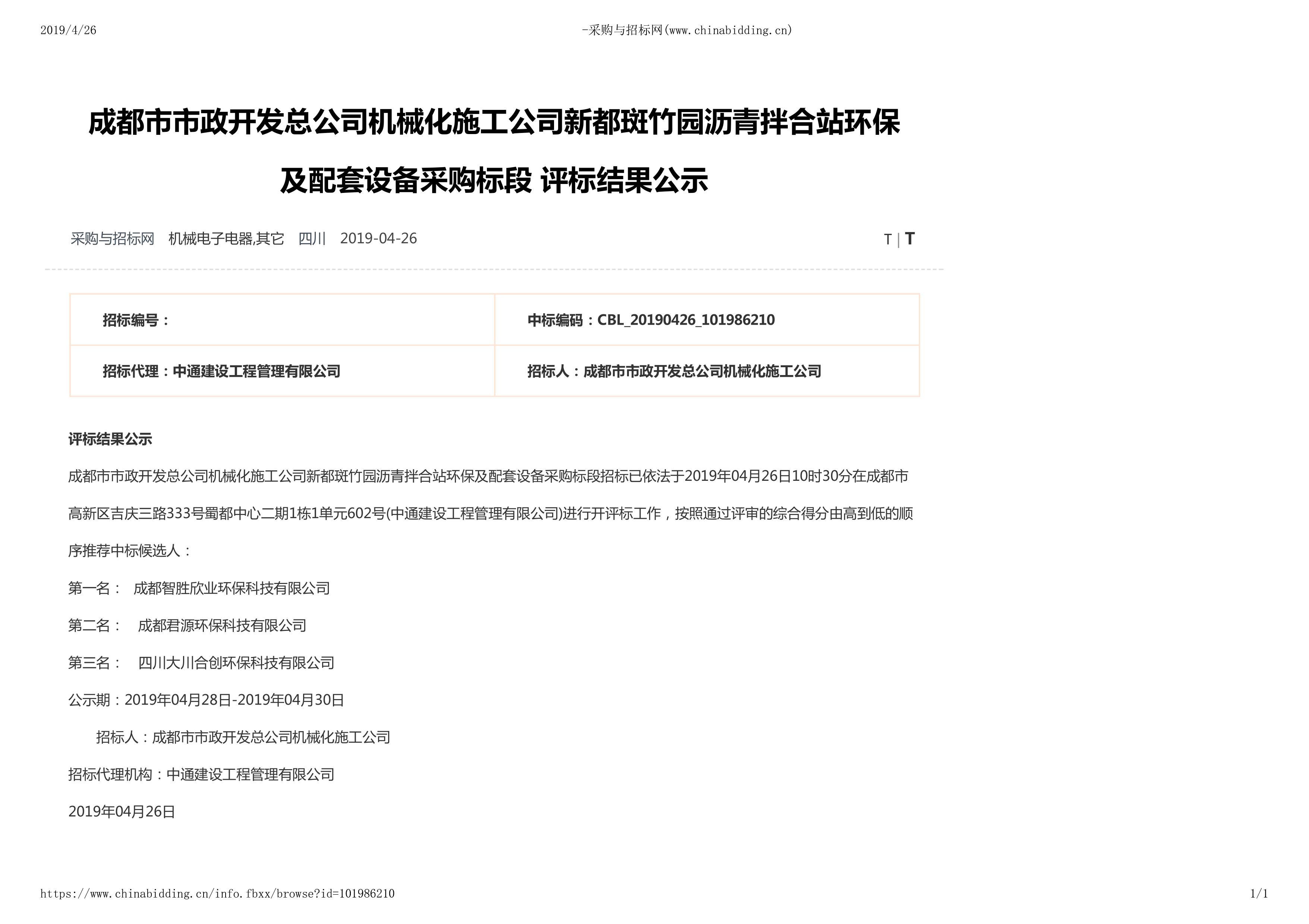 jS333金沙线路机械化施工公司新都斑竹园沥青拌合站环保及配套设备采购标段评标结果公示
