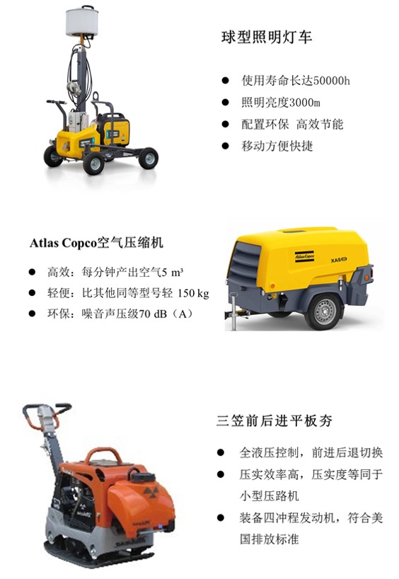为提高维护质量,提升维护效率,减少噪音扬尘扰民,公司根据现场施工特点,采购了球型照明灯车、Atlas Copco空气压缩机、三笠前后进平板夯等一系列行业领先的工程机械设备。实践应用表明,新型工程机械设备能有效地减少噪音,控制施工扬尘,减少施工带来的环境污染问题。