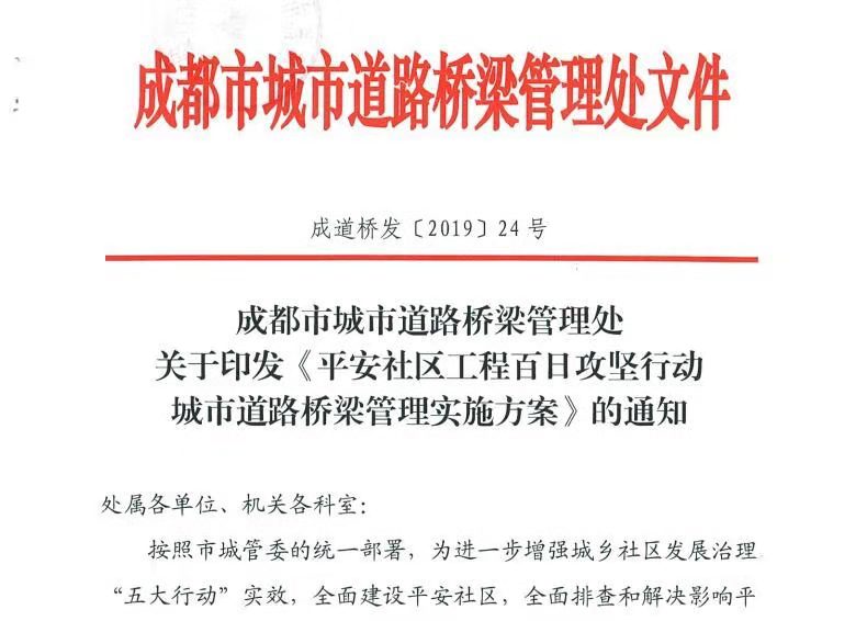 按照成都市城管委的统一部署,为进一步增强城乡社区发展治理“五大行动”实效,全面建设平安社区,市道桥监管中心下发《平安社区工程百日攻坚城市道路桥梁管理实施方案》,总公司(三所)按照市道桥监管中心工作要求,积极开展平安社区百日攻坚专项行动。