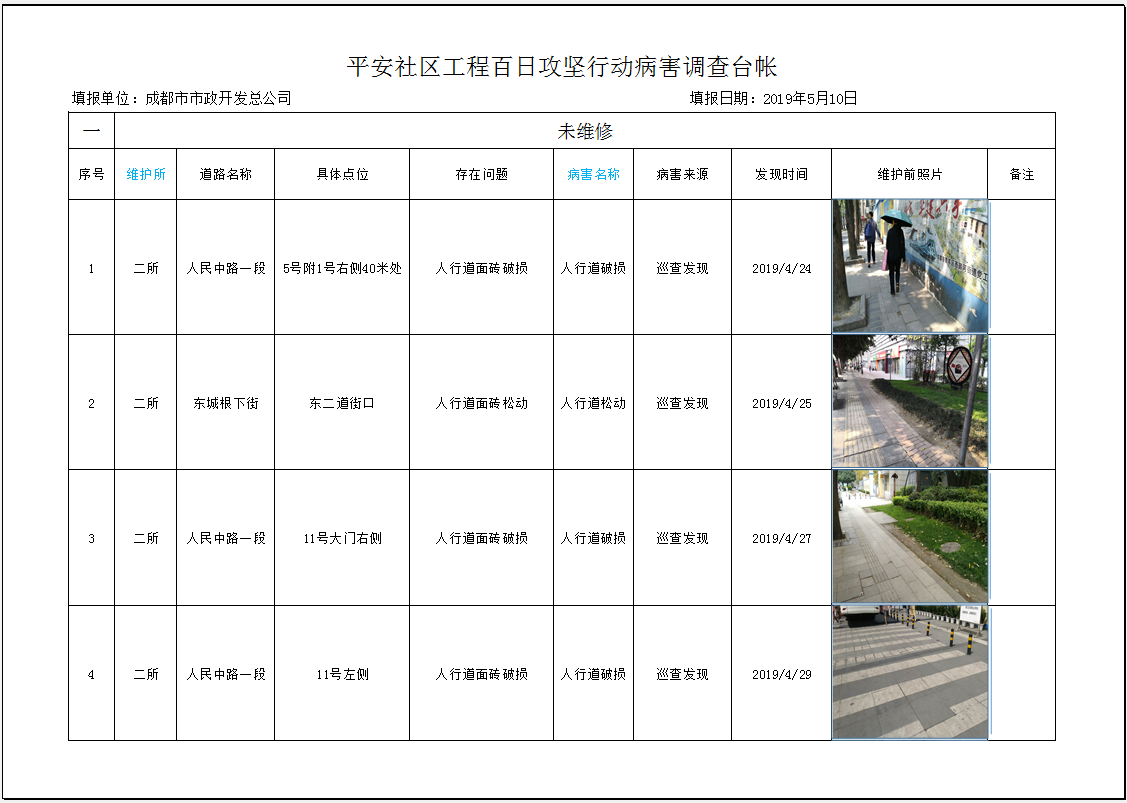 公司(三所)以人行道松动、破损、沉陷,车行道沉拥包、坑槽、空洞,桥面系铺装破损、积水、沉陷等病害为排查重点,对管辖范围内市管道路桥梁进行全覆盖排查,建立隐患病害台账,及时落实整改。