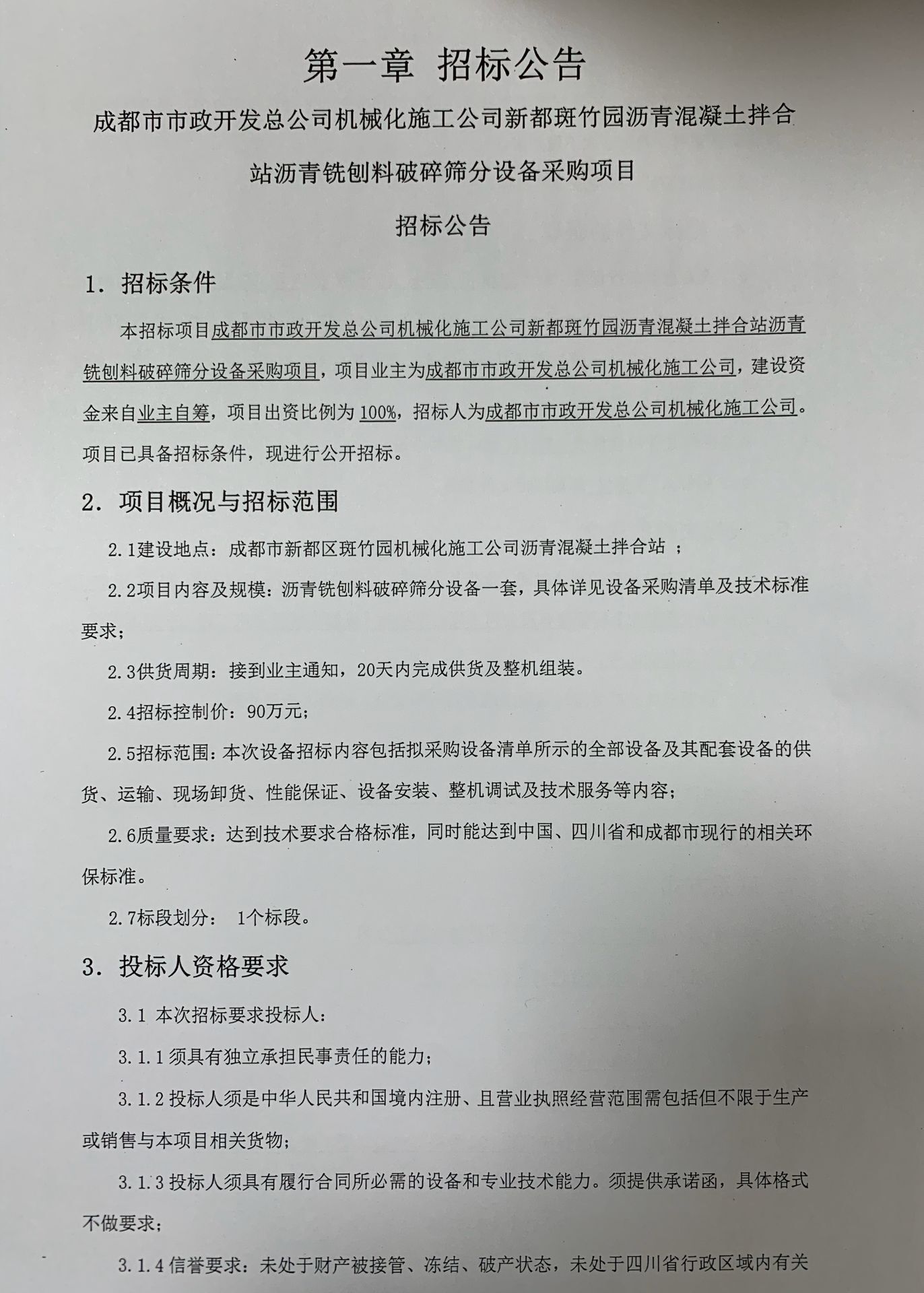 jS333金沙线路机械化施工公司新都斑竹园沥青混凝土拌合站沥青铣刨料破碎筛分设备采购项目招标公告