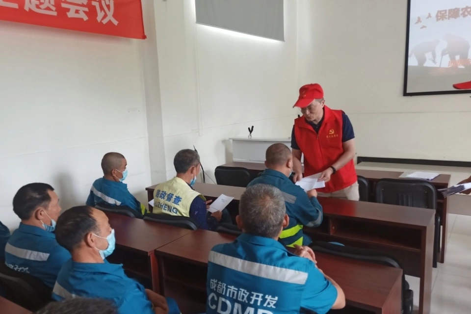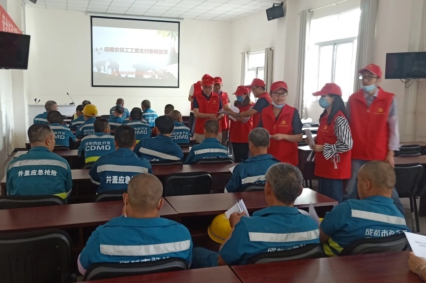 2020年5月26日,成都市城市道路桥梁监管服务中心邓红波副主任带队前往总公司检查井盖研发和培训基地开展志愿活动,到一线农民工身边宣贯《保障农民工工资支付条例》。