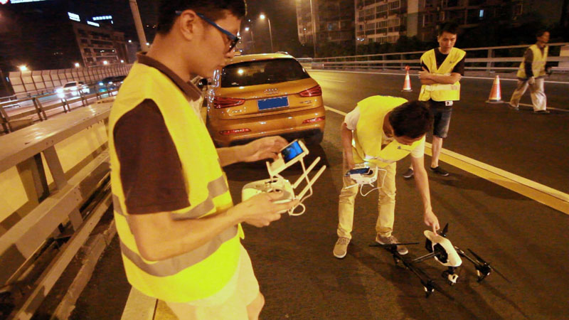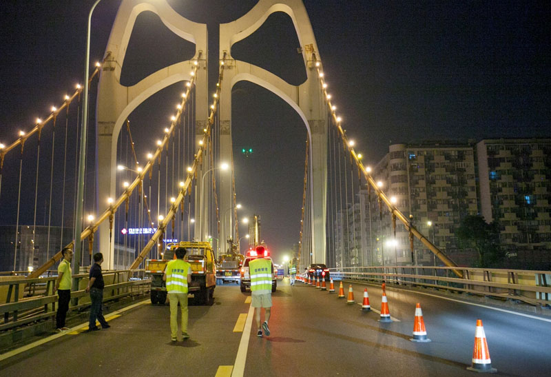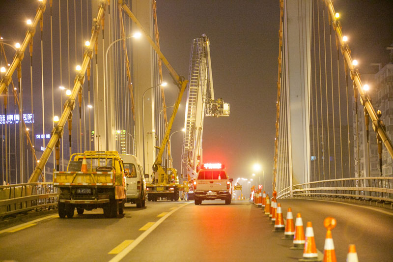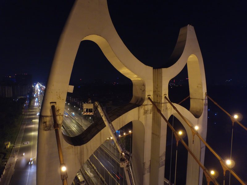 检测当晚,在消防部门提供的50米高空云梯车协助下,检测工作顺利开展。公司首次采用无人机对检测过程进行航拍,并充分利用无人机飞行灵活、高清摄影及高分辨率拍摄的优势,采取录像和悬停拍照等方式,为检测技术人员提供悬索桥高空结构部位更为全面的数据和信息。此举也是我公司按照道桥处要求,实施二环路高架桥创新管理的新举措。