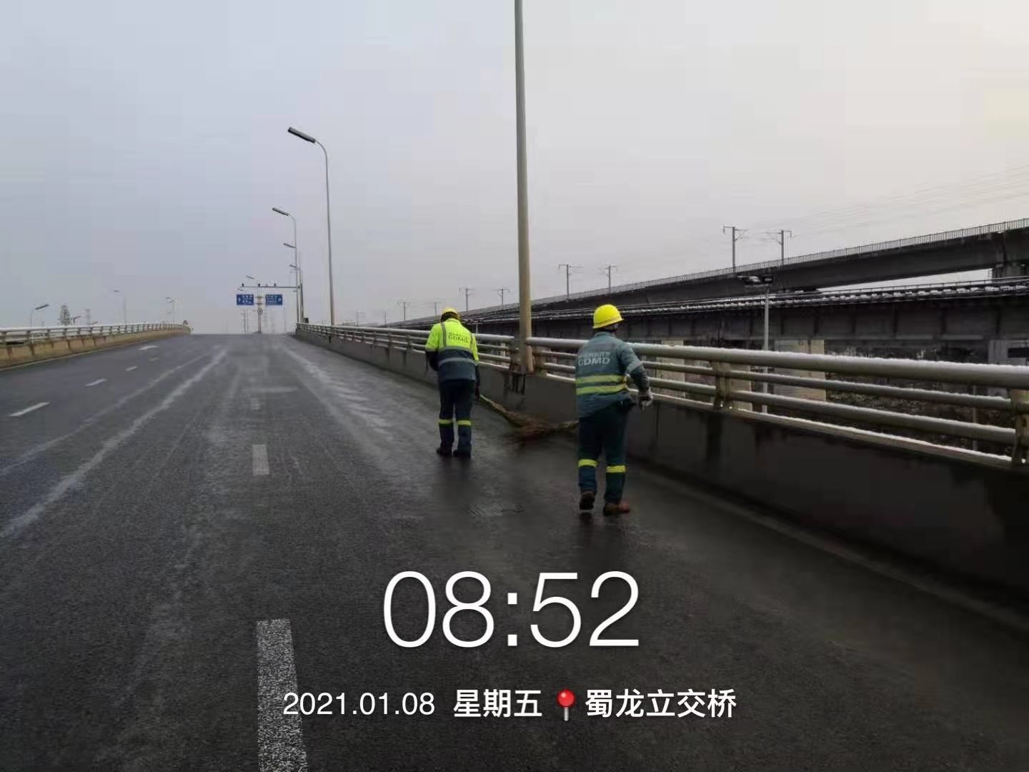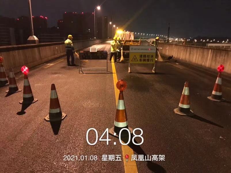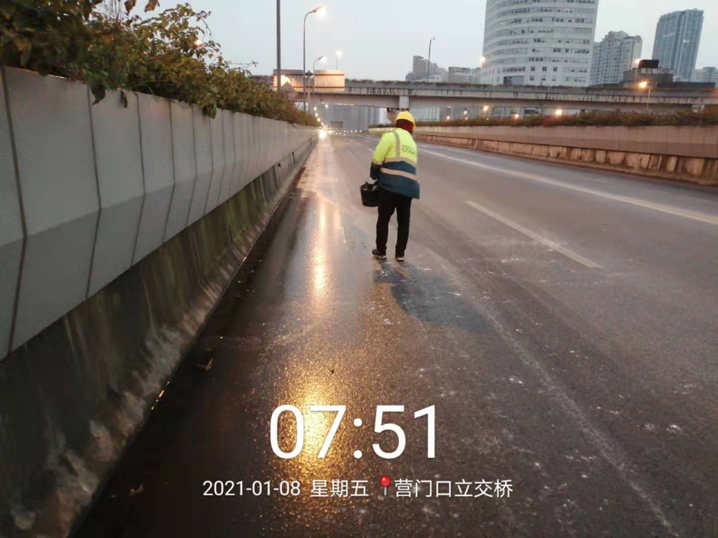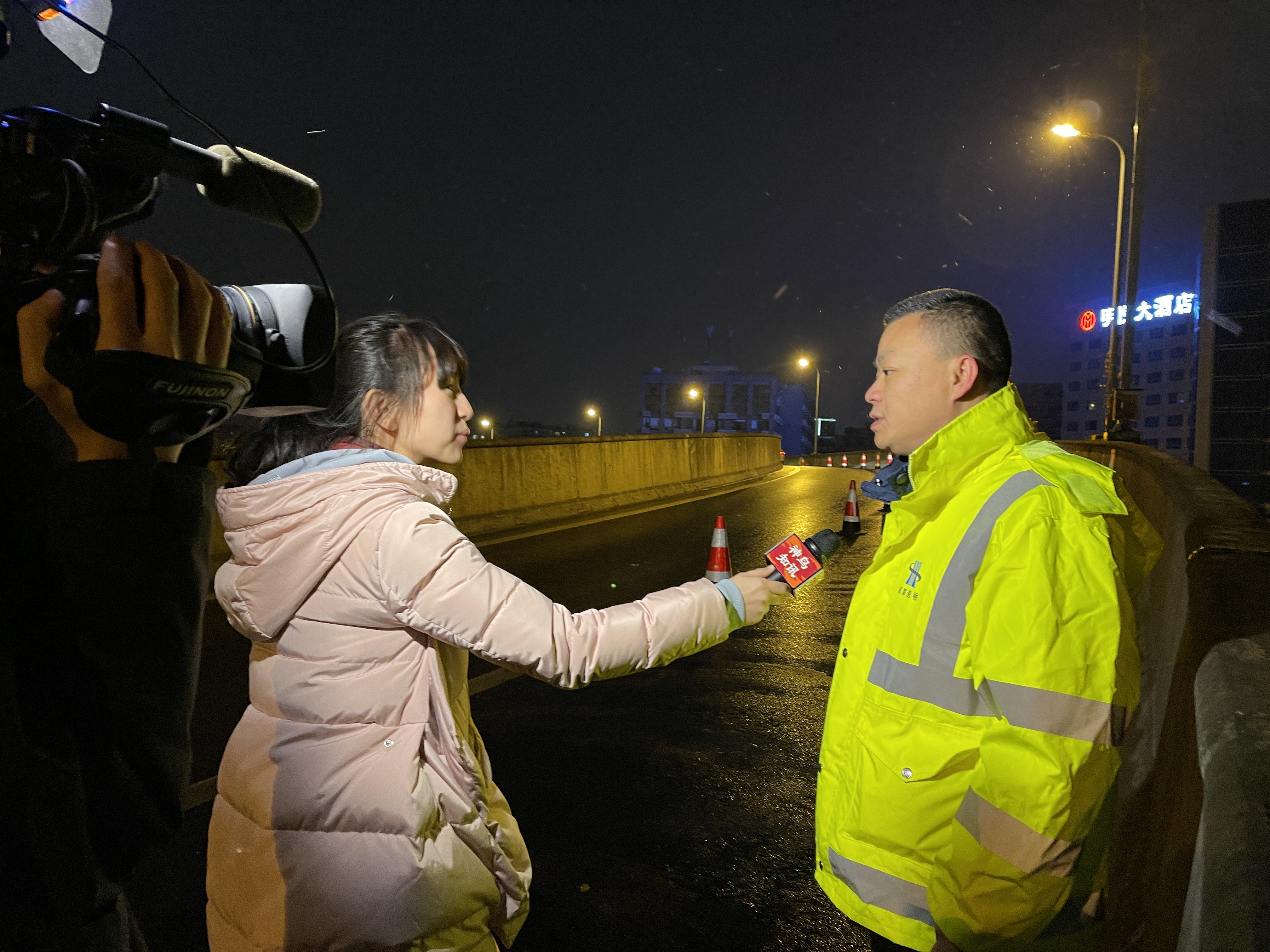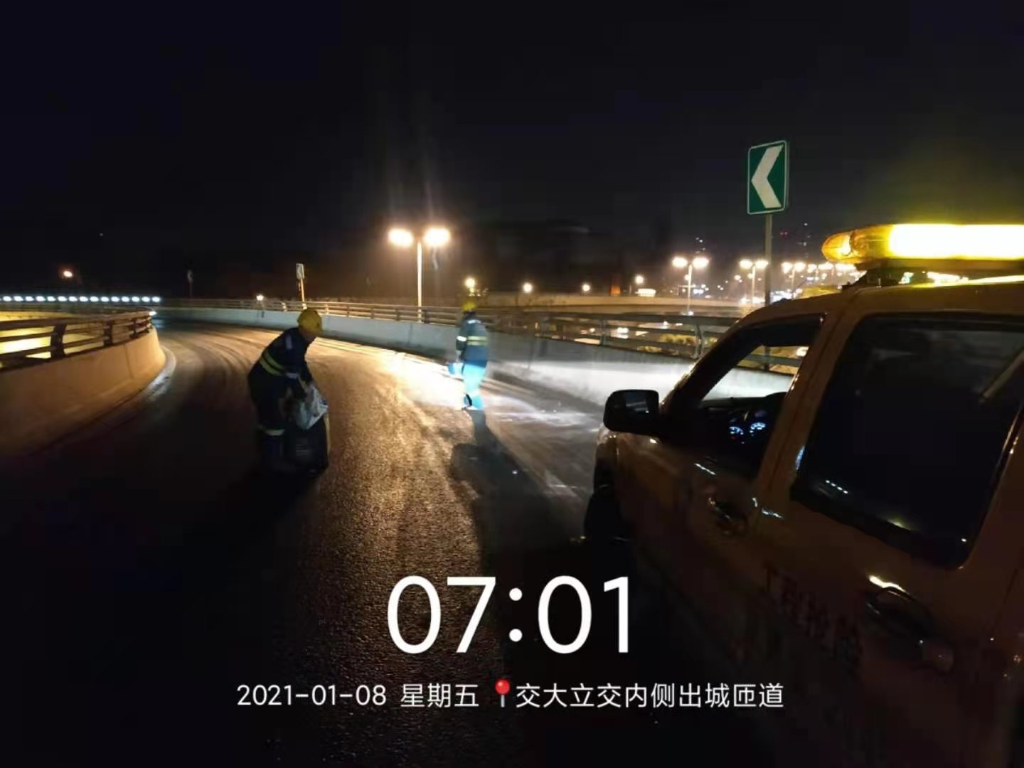晚上11时,领导班子兵分两路,分别前往结冰情况较严重的永丰立交桥和迎晖路跨线桥进行现场指挥。