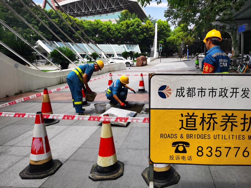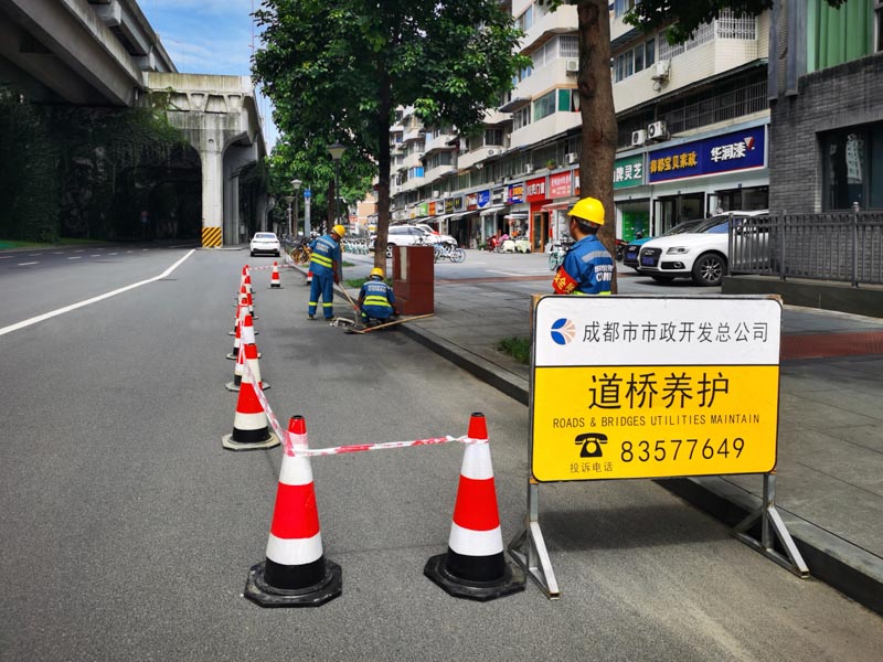 道路设施维修作业时,我司严格按照养护技术规范,精心组织,规范操作。维护现场安全警示措施齐全,施工打围规范,并配备有专职的安全员。通过一系列规范化作业,保证了维护质量和效率。