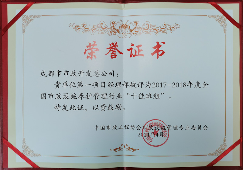 近日,中国js333国际线路检测协会市政设施管理专业委员会九届二次会员大会在成都圆满落下帷幕。jS333金沙线路第一项目部层层突破,脱颖而出,荣获2017-2018年度全国市政设施养护管理行业“十佳班组”。