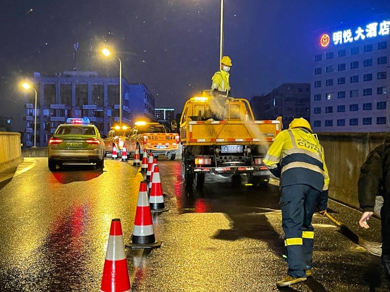 每年冬季出现强降温天气时,他们昼夜不停,奔赴在每天主干道、高架桥上,用眼睛看、用手去触摸,细致、反复地检查道路的情况,一旦发现结冰,立即安排处理;就这样周而复始,24小时三班倒,在低温天气排除一个又一个安全隐患。他们充分发挥“不怕苦、不怕累、不服输”的精神,自项目部成立以来,低温天气排除隐患200余处。