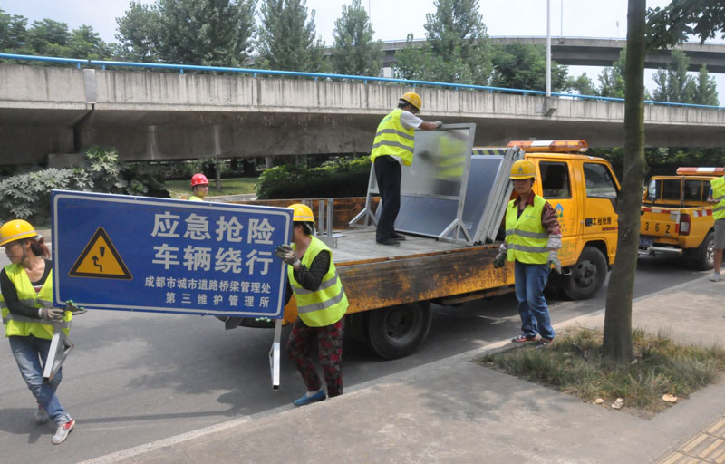 抢险小组到达现场后,应急抢险现场总指挥(指挥中心负责人)分别对三个小组做了现场抢险工作安排。要求对抢险区域全幅封闭,设置警示标志标牌,进行交通分流,并用水泵进行抽水。各小组均按照要求进行了交通引导、道路打围、排水作业等。