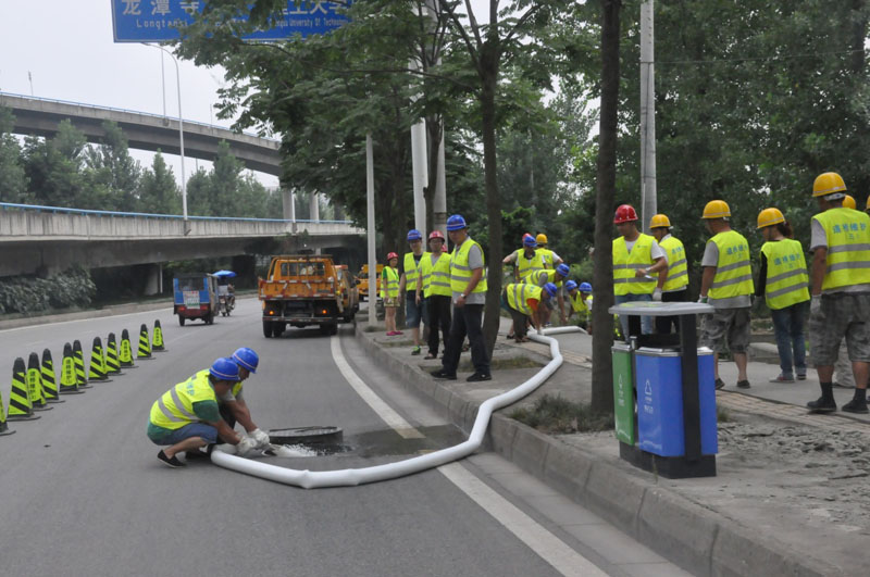 7月31日13:30,应急抢险队长接到险情通知“三环路龙潭立交内侧路面积水严重,积水有进一步加深的趋势”,根据险情,启动Ⅰ级防汛应急抢险预案,由应急抢险组指挥中心分别逐一通知各应急抢险小组。三个抢险小组的抢险队员和应急物资均在一个小时内赶到指定地点,本次演练共出动抢险应急队员48人次,应急车辆设备11台次。