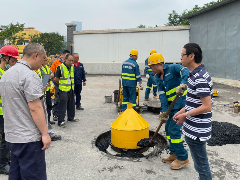 培训现场,井盖基地技术负责人刘世良详细讲解了球墨铸铁可调式防沉降检查井盖安装维护技术和施工工艺,现场演示了沥青路面拆除、建渣承盘安装、柴油涂刷、调节环安装、沥青铺筑、井盖安装等各个施工工序,并对井盖施工中易出现的质量通病做了分析。