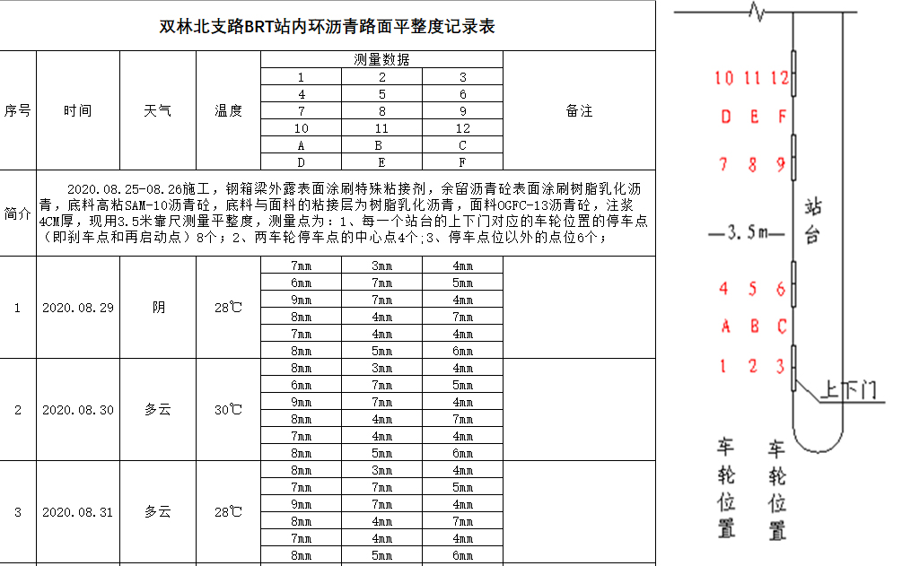 试点工作完成后,我公司组织建立了专门的数据监测点位,组织了专业技术人员对点位进行定期观察和巡检,同时采集数据形成测量台账,及时进行数据对比分析。该点位经过10个月的正常使用,目前未产生病害,外观质量良好,各项数据基本符合规范要求,满足使用要求。