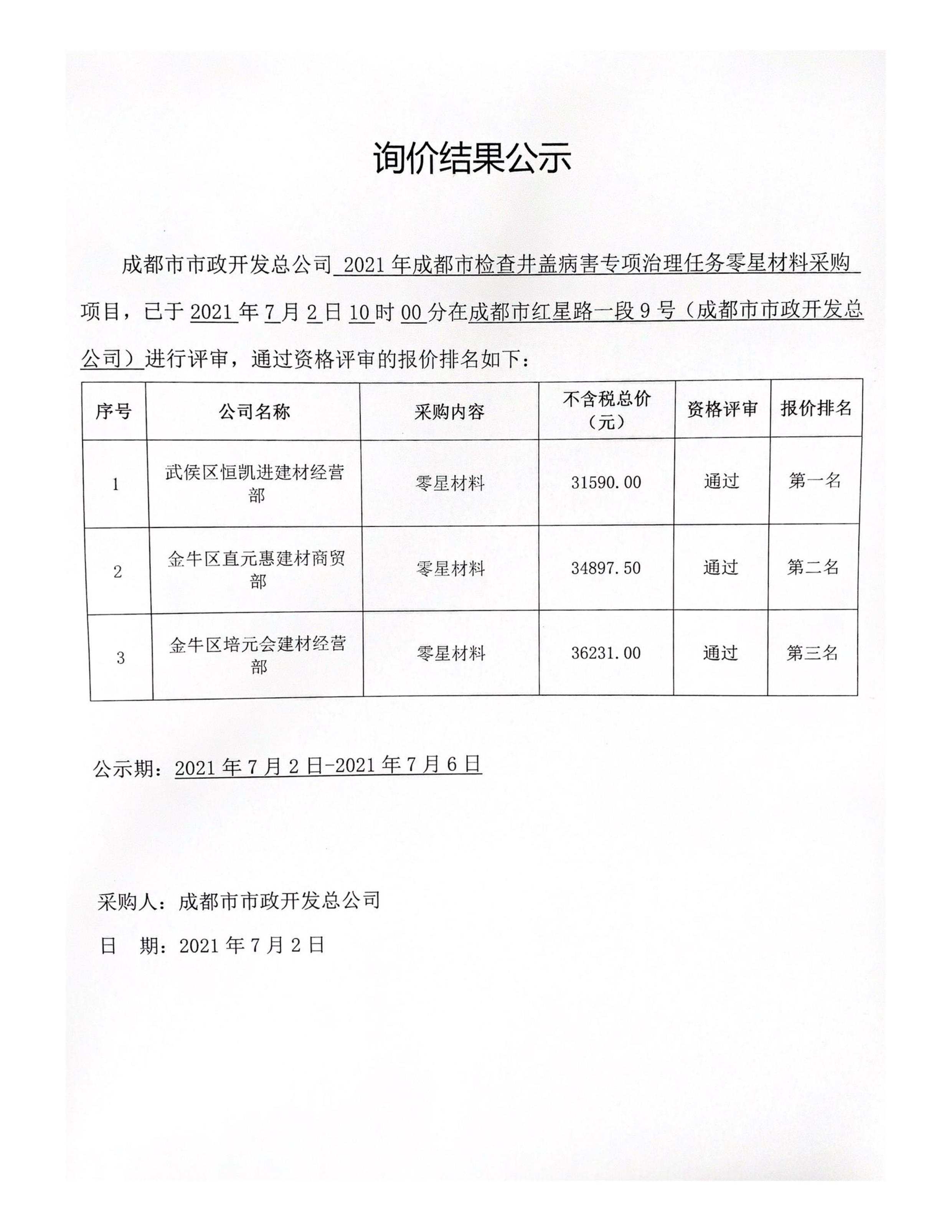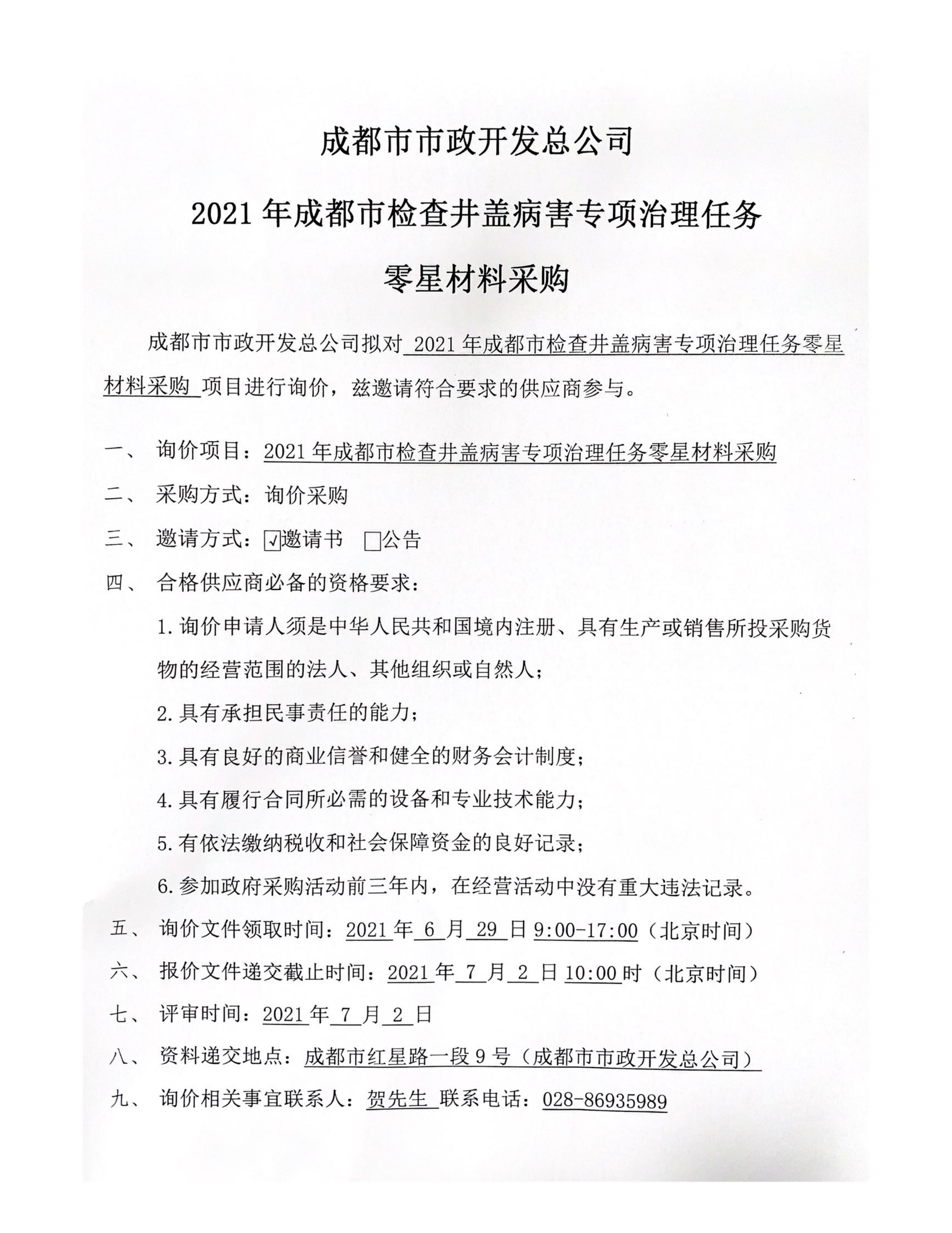 jS333金沙线路2021年成都市检查井盖病害专项治理任务零星材料采购询价结果公示