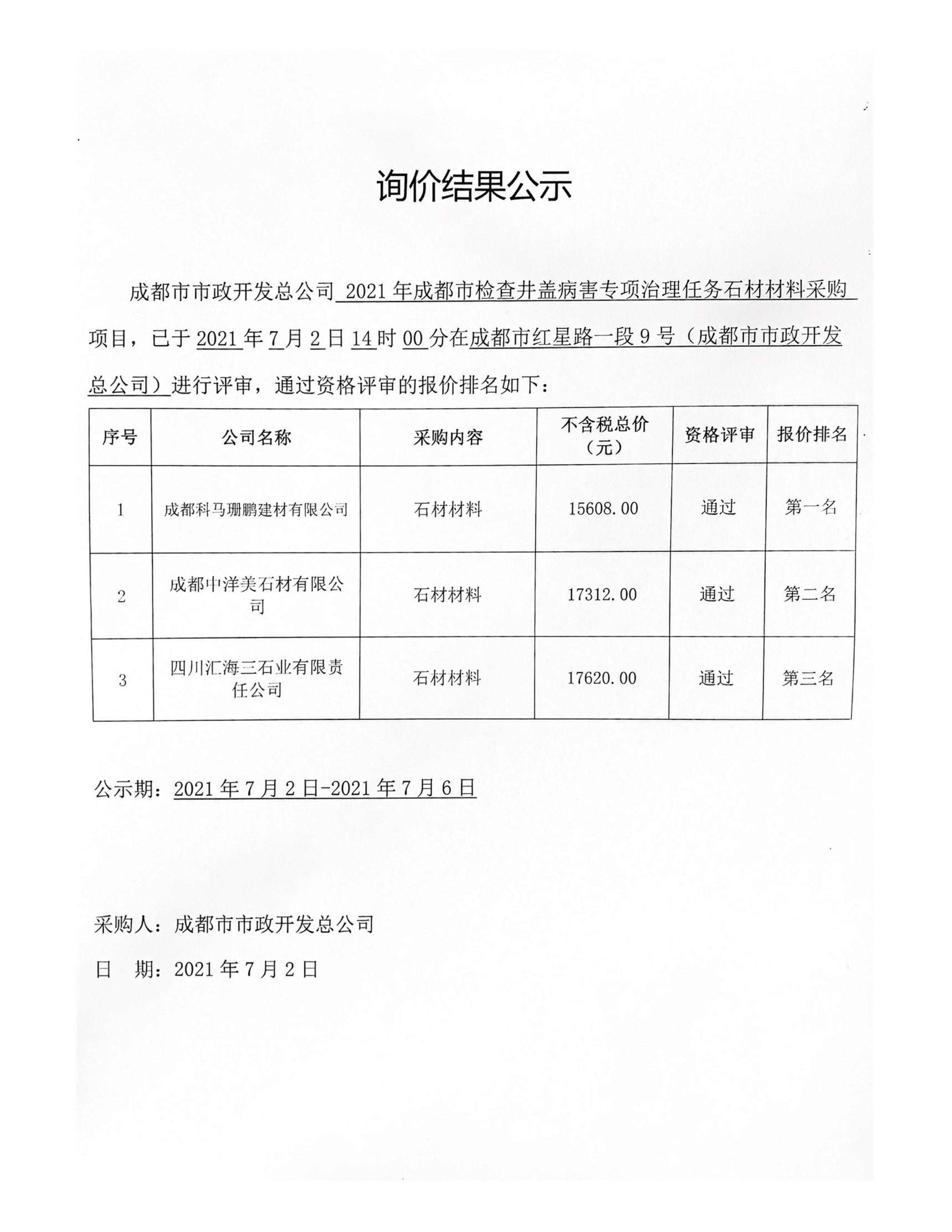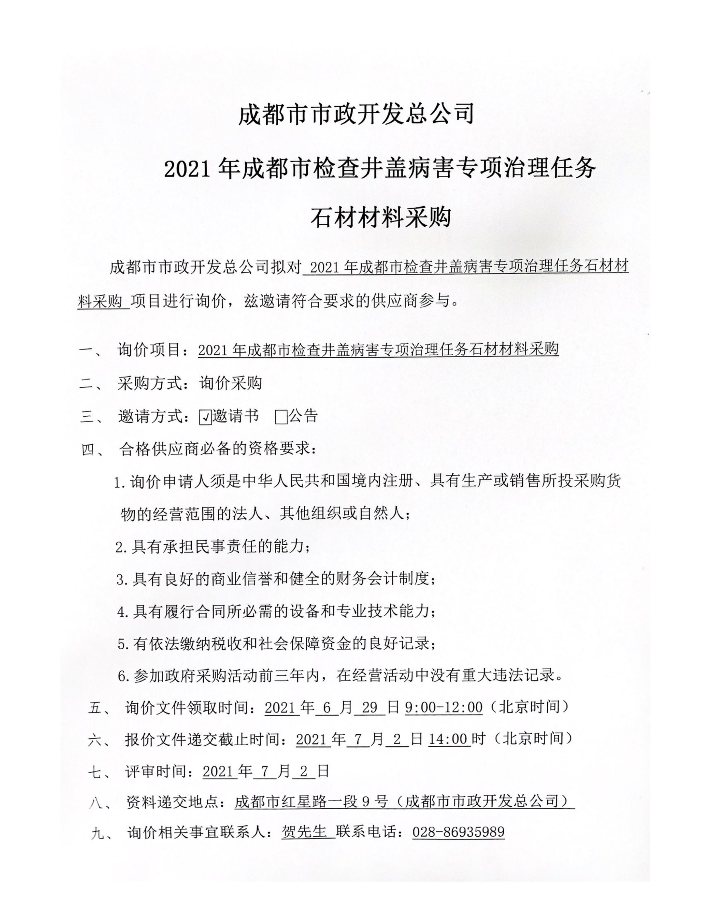 jS333金沙线路2021年成都市检查井盖病害专项治理任务石材材料采购询价结果公示