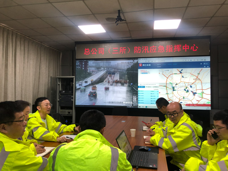 ▲总公司(监管三所)防汛应急指挥中心,通过桥梁水位预警系统和天网摄像头对全市道桥积水点位进行监测,实时调度各抢险队伍。
