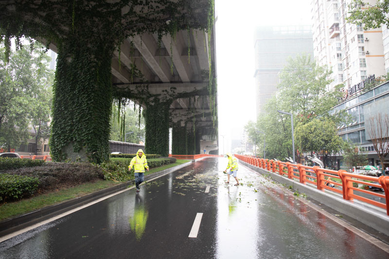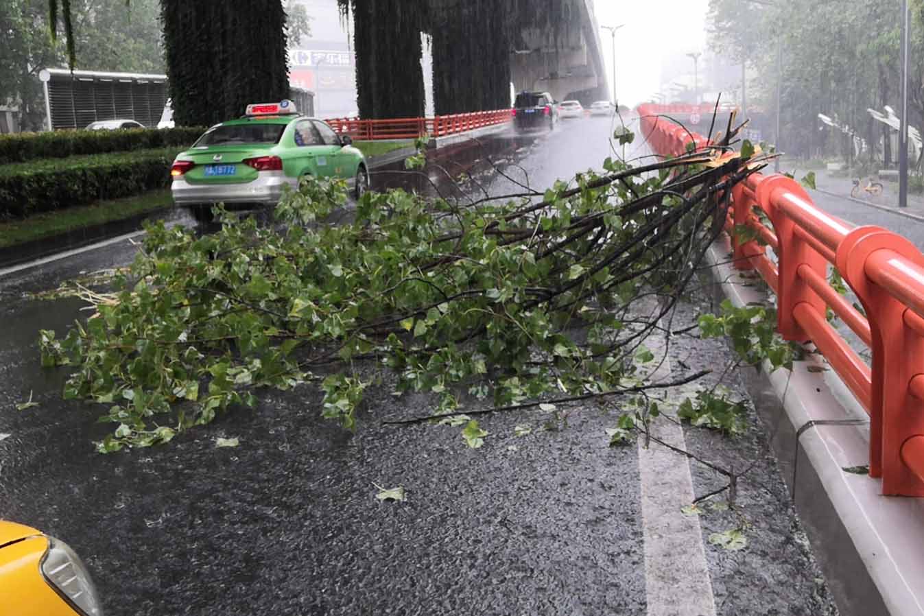 ▲府青路跨线桥匝道一大树倾倒,影响车行道通行,抢险人员将树木枝丫拖到绿化带,恢复了现场交通。