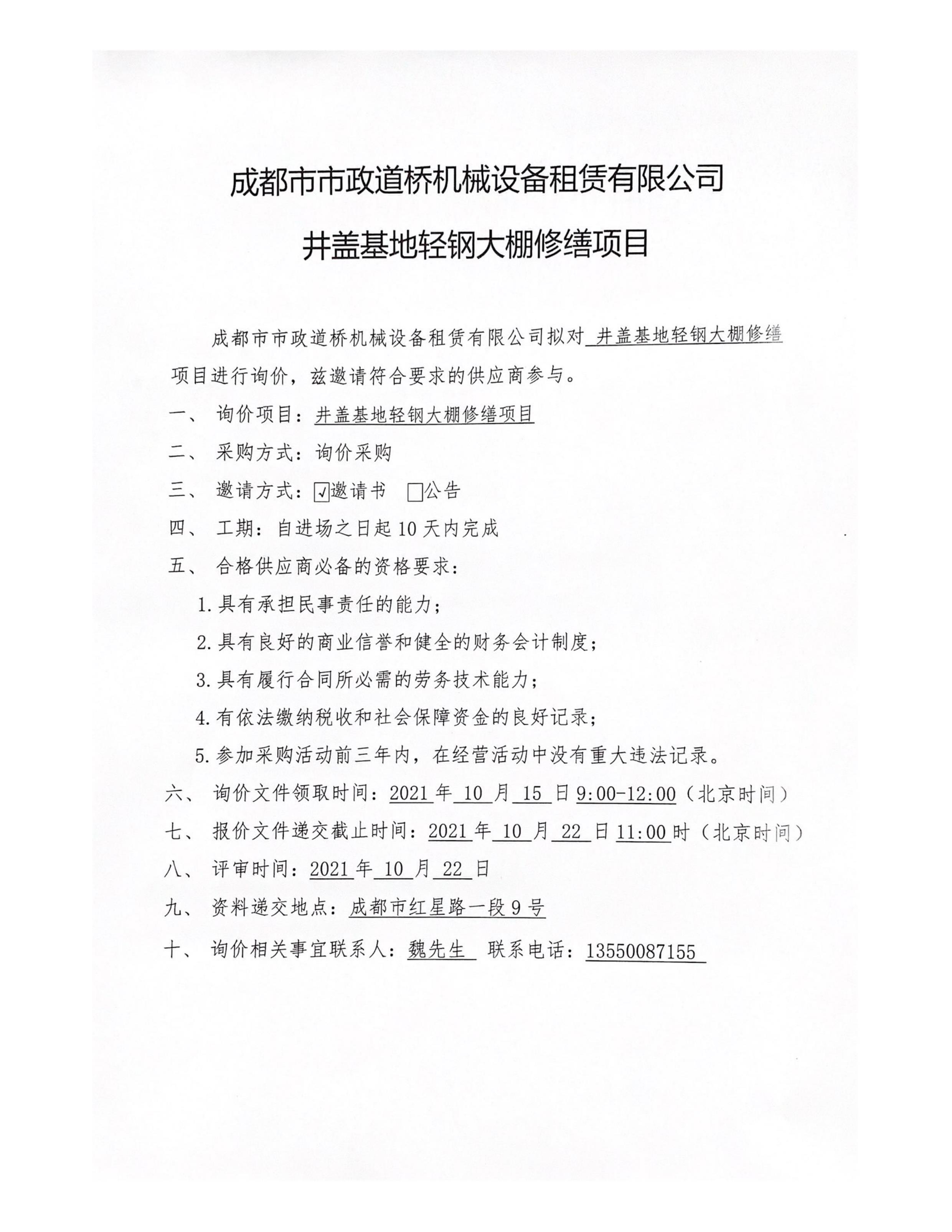 成都市市政道桥机械设备租赁有限公司井盖基地轻钢大棚修缮项目询价结果公示
