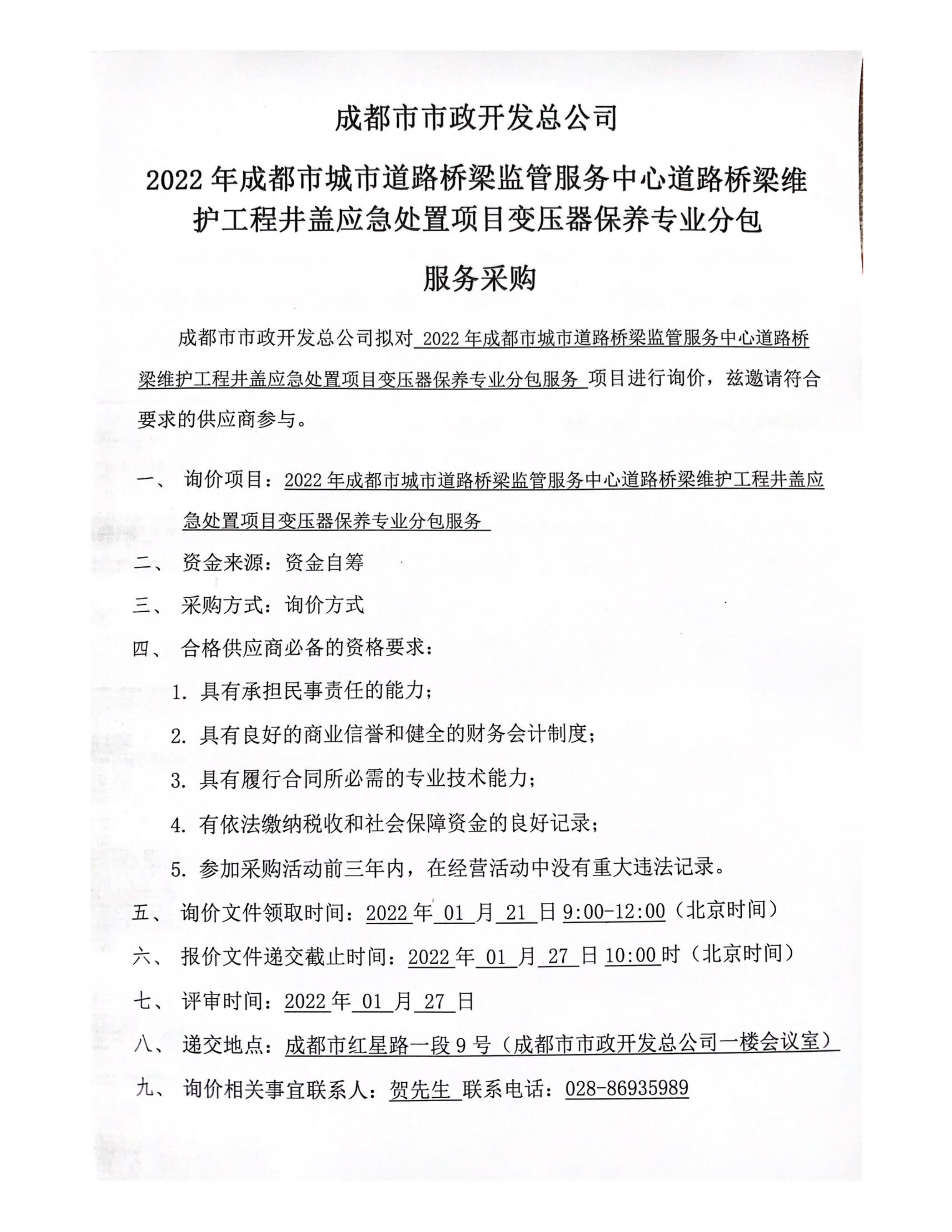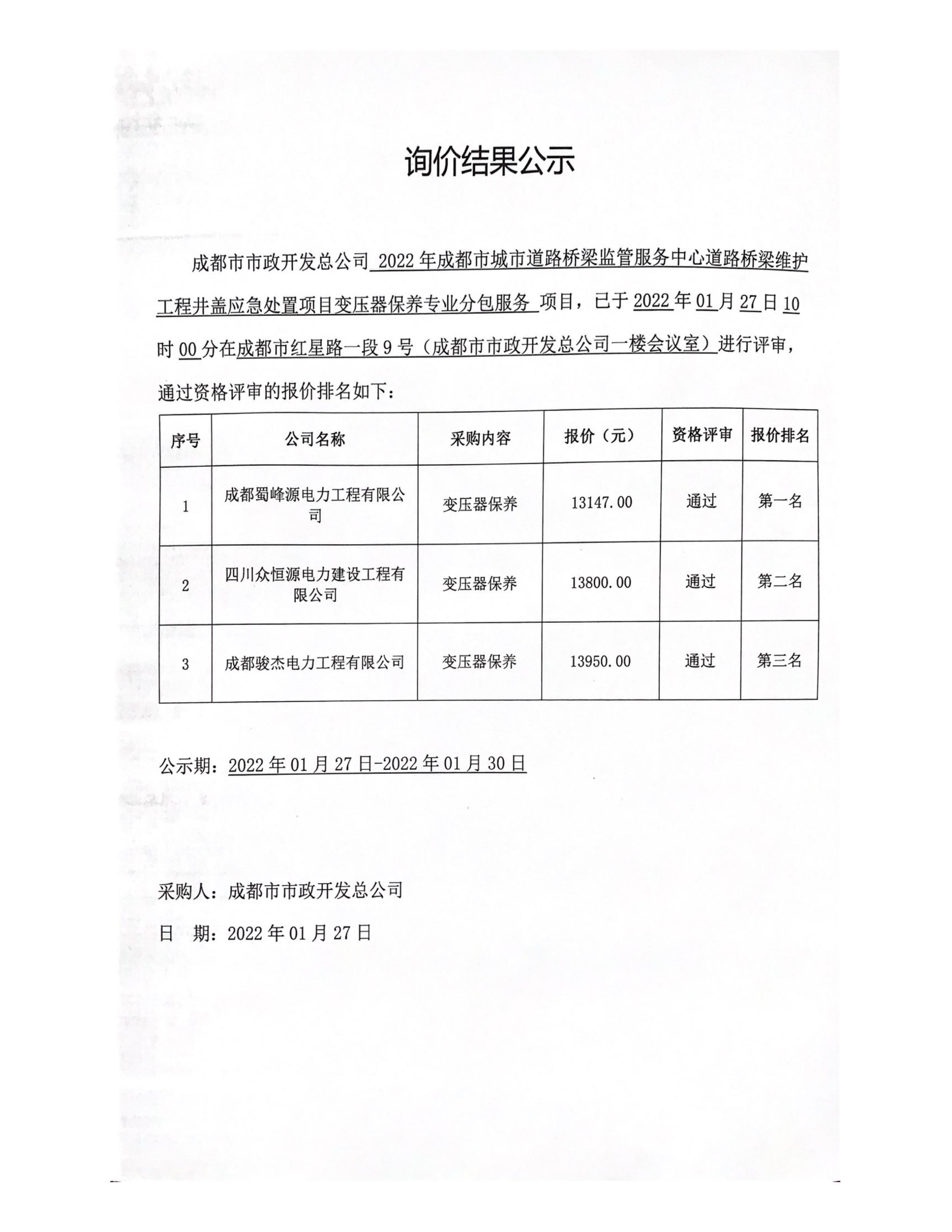 jS333金沙线路2022年成都市城市道路桥梁监管服务中心道路桥梁维护工程井盖应急处置项目变压器保养专业分包服务询价结果公示