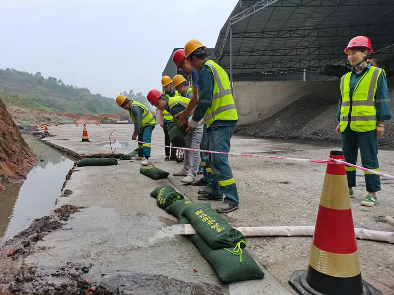 演练模拟了拌合站发生暴雨积水的情况,发现险情后,防汛指挥部根据水位深度,立即启动“三级响应”流程。参演人员按照规定流程积极响应,组员间分工明确、配合默契,防汛器械迅速安装,防汛沙袋布设到位,积水抽排迅速完成。