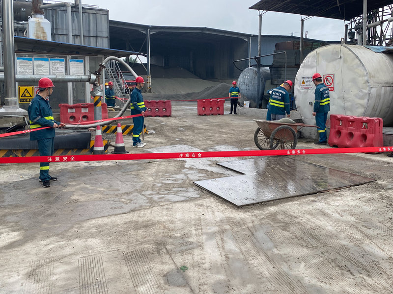 演练模拟了生产工人失误导致沥青罐冒罐沥青流到地面上的情景。为防止沥青泄漏污染土壤和地下水,生产工人立即报告给站长,站长决定启动突发环境事件应急预案,各站点应急救援小组迅速带着沙袋、铁铲、应急收集桶、等物资前来处理,成功控制这起突发环境事件,避免对园区及外部环境造成更大破坏。