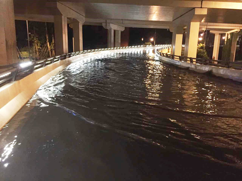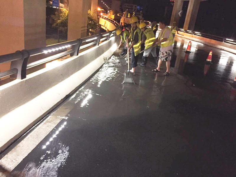 2016年7月11日凌晨2时10分,我市突降暴雨,强降雨过程持续约40分钟,我公司管辖的道路桥梁设施经受了今年入汛以来最大的考验。强降雨开始后,公司维护管理人员立即开展了设施巡查工作,对高架桥、底层立交桥及跨河桥设施状况进行了核查,发现强降雨期间二环路高架桥部分点位出现暂时性的严重积水,尤其是顶升桥段,积水最深处超过10公分。凌晨3时20分,降雨量减小半小时后,高架桥上积水基本排走,仅有局部点位存在少量积水。同时,底层立交桥方面,刃具厂由东至西二层匝道最低点处积水严重,积水深度约20公分。人南立交二环直通道与西北侧匝道相接位置有较大积水面,因匝道较宽,暂不影响车辆通行。公司立即组织人员对积水严重的点位用锥形桶进行了交通疏导,并摆放绕行提示牌,安排专人指挥车辆绕行通过。随后对积水路段进行了除水作业。至凌晨4时30分,二环高架桥、底层立交桥及跨河桥已无明显积水。本次应急处置共出动人员20名,机械设备6台。